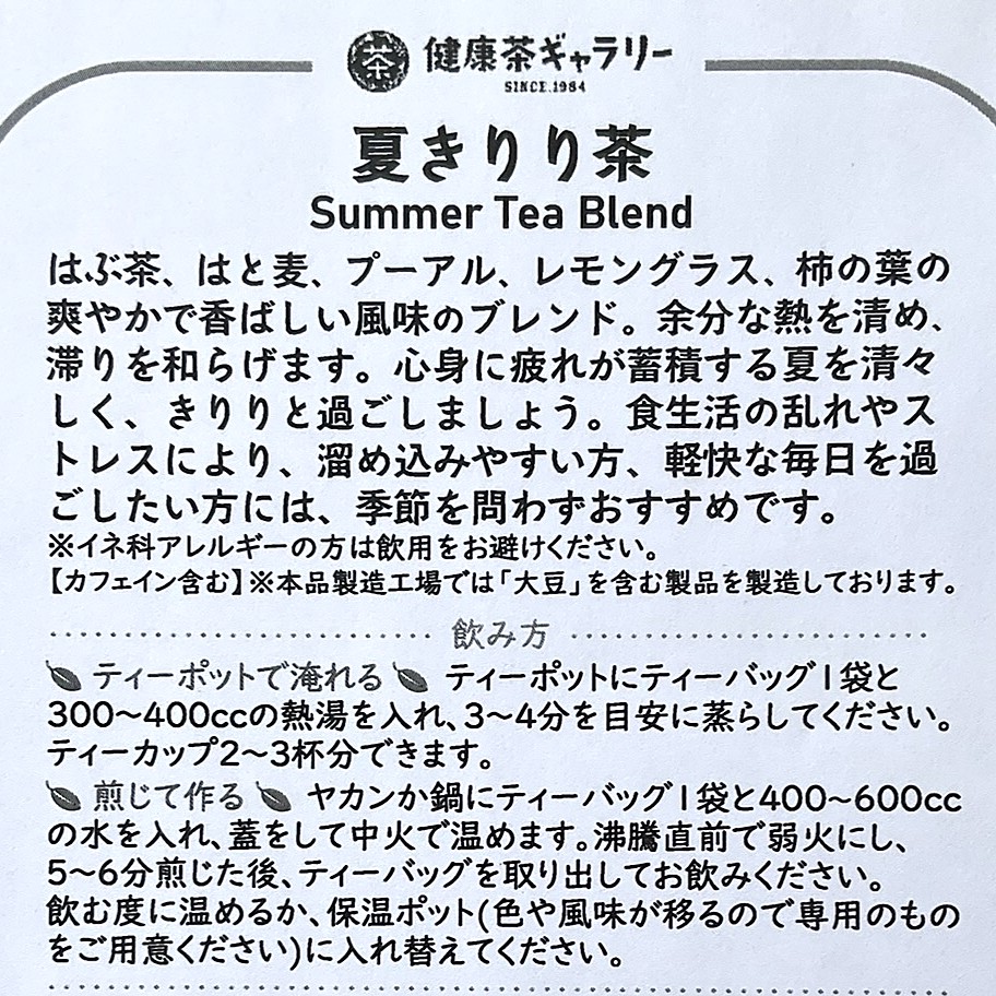 原材料:エビス草の種子(インド産)、はと麦(中国産)、 後発酵茶(中国産)、レモングラス(エジプト産)、柿の葉(国産) 製造加工地:日本